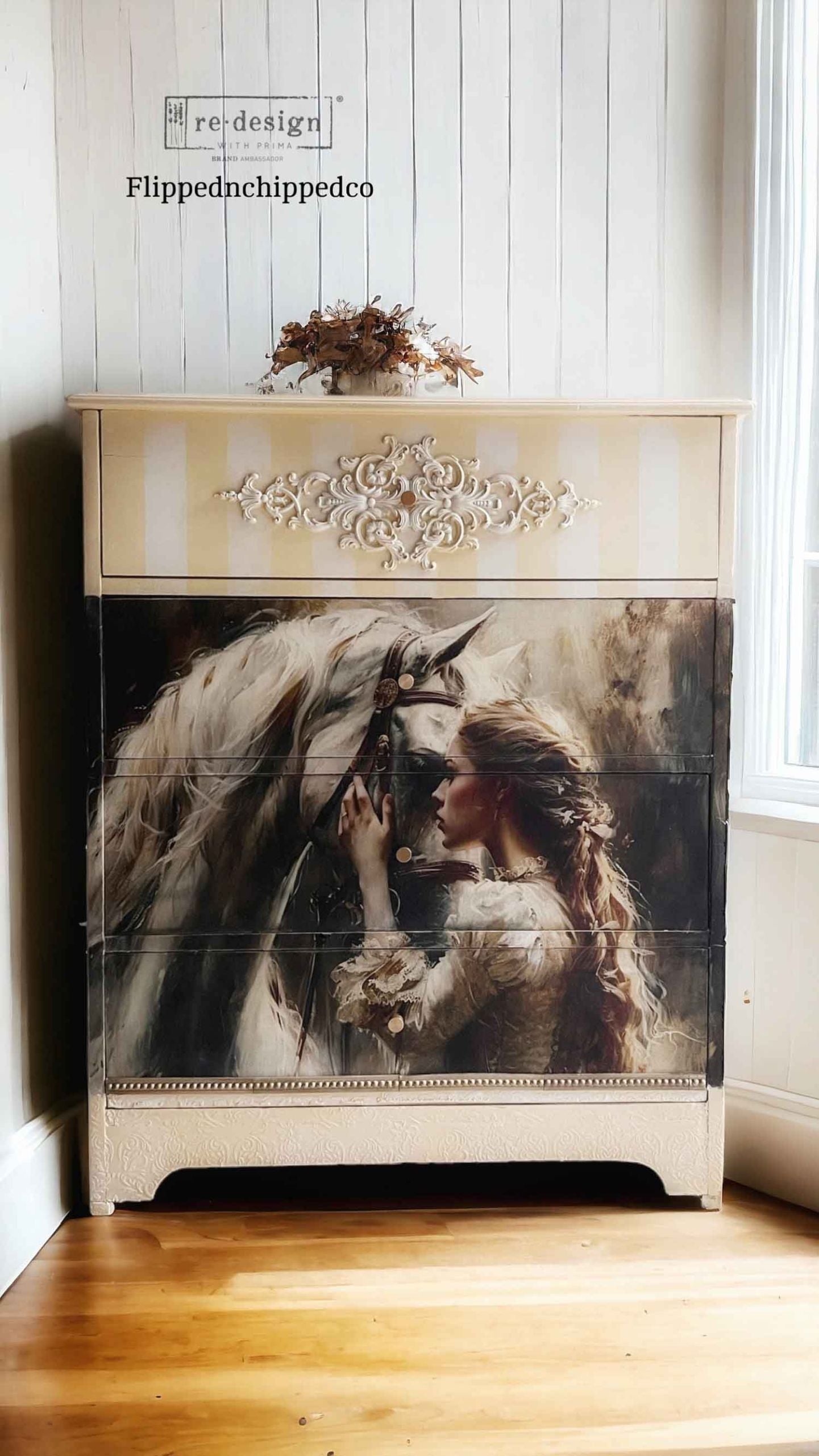 The Redesign with Prima® A1 Decoupage Fiber Paper, “Soulful Bond,” captures a moment of timeless connection and elegance between a beautiful white horse and her equally stunning owner, a lady exuding grace and poise in an elegant dress. This decoupage fiber paper, is a masterpiece of equine and human connection, embodying the deep bond that exists between horse and rider. Our A1 Decoupage Paper is incredibly easy to use. Simply measure and cut the desired amount of paper, add Decoupage Gel on the prepared surface, set paper on top and smooth it with the Scraper Tool or Brayer. Our Décor Tissue Paper is created for use on walls, furniture, and other décor items.