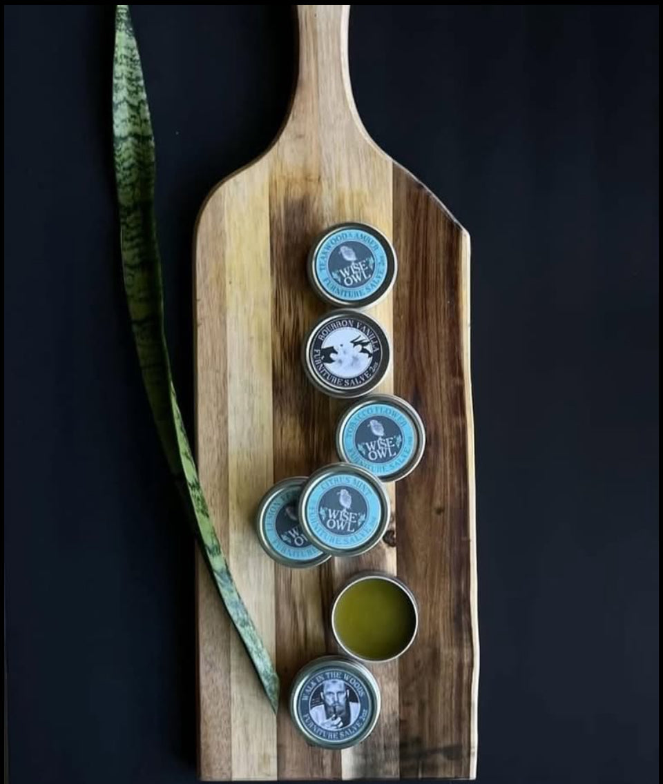 If you love Furniture Salve, you'll love this set! A sample set of 6 popular scents of our Favorite Wise Owl Furniture Salve includes: a 2oz sample Bourbon Vanilla, Citrus Mint, Lemon Verbena, Teak wood and Amber, Tobacco Flower, and Walk in the Woods. Choosing your favorite is always the hardest, let us help!